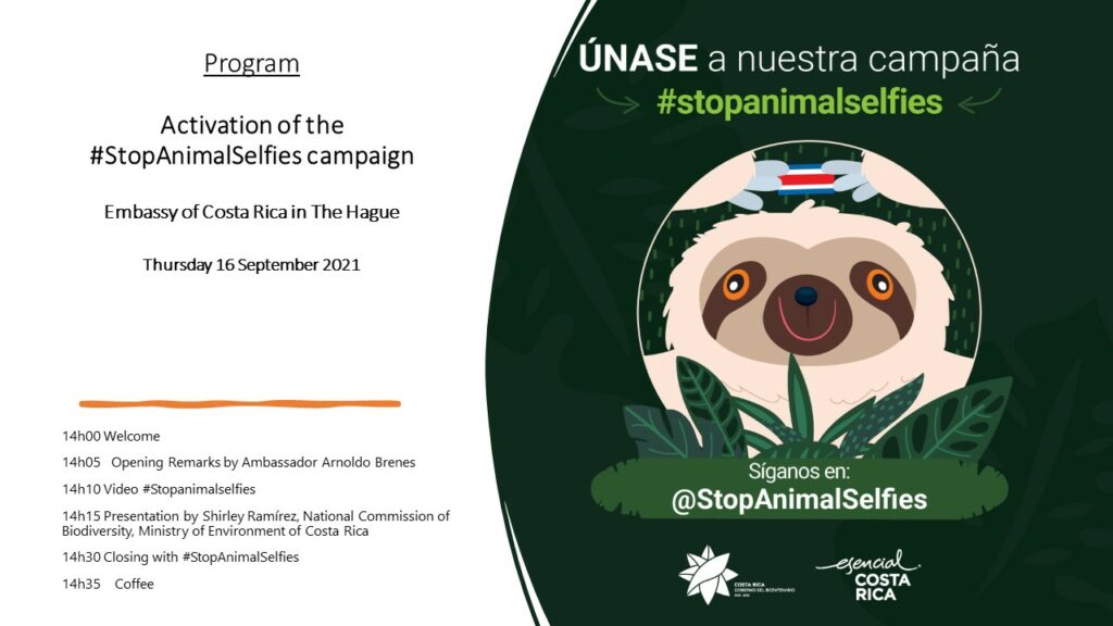 The Republic of Costa Rica holds an important place in the world as one of the most significant national supporters of ecological and animal protections. The protection and preservation of their natural environment and around the world has long been a core tenet within their national politics and diplomacy. This emphasis continues even in the Netherlands as Ambassador of Costa Rica, H.E. Mr. Arnoldo Brenes Castro hosts events on this topic, including one on September 16, 2021, highlighting the harmful practice of “animal selfies” and the importance of reducing direct human (read: tourist) contact with wildlife.